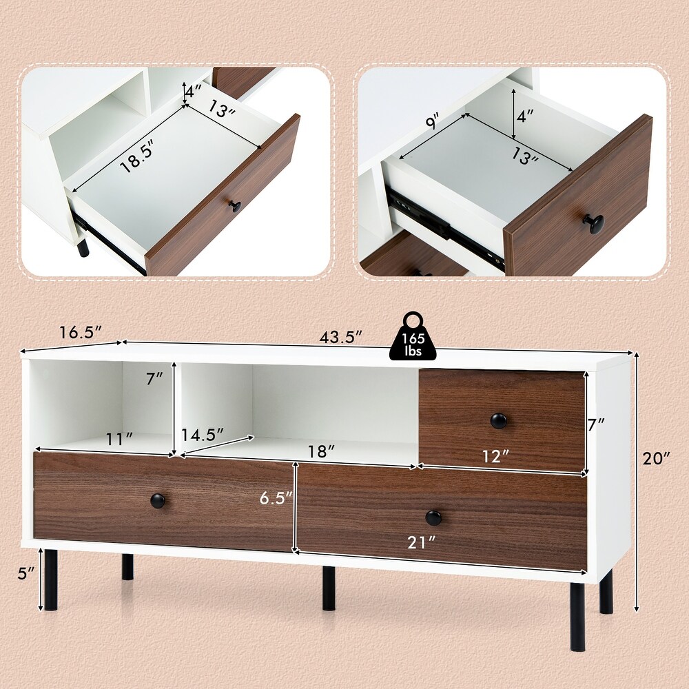 The multifunctional console cabinet is a stylish and functional addition to your living room or bedroom! The entertainment center features a wide tabletop for TVs and other ornaments, and open and enclosed storage space to organize media supplies. Meanwhile, you can easily open the drawers that are fitted with handles and smooth slides. What’s more, the TV stand boasts reliable 5-leg support, which is made of heavy-duty steel for a long service life. And you don’t have to worry about the metal legs scratching the floor, since they are equipped with protective pads for added stability. In addition, the TV console cabinet with clean white finish and elegant walnut grain matches different decorations.
