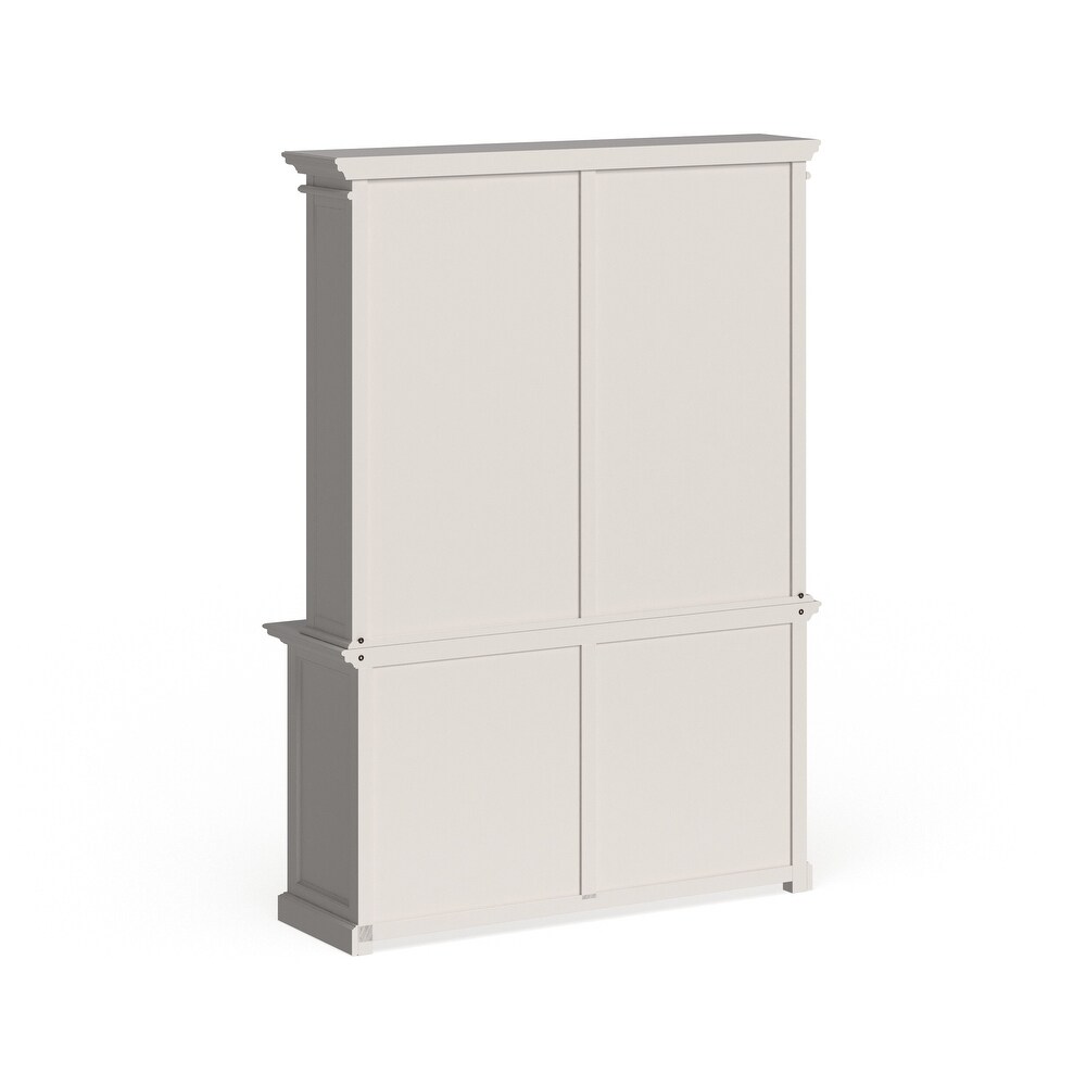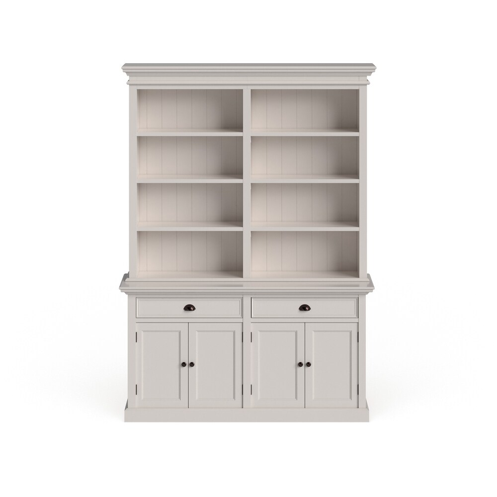 Elevate your home decor with the NovaSolo Halifax Mahogany Hutch/ Bookcase Unit. Crafted from kiln-dried solid mahogany, this hutch-bookcase combination is built to last. With a pure white semi-gloss painted finish topped with a durable sealer, it exudes elegance and sophistication. The hutch features four doors that open to two interior shelves and two large drawers, offering ample storage space. The eight deep exterior shelves provide ample space for displaying your favorite books and collectibles. Antique brass hardware with a dark bronze tone adds to the hutch's charm.